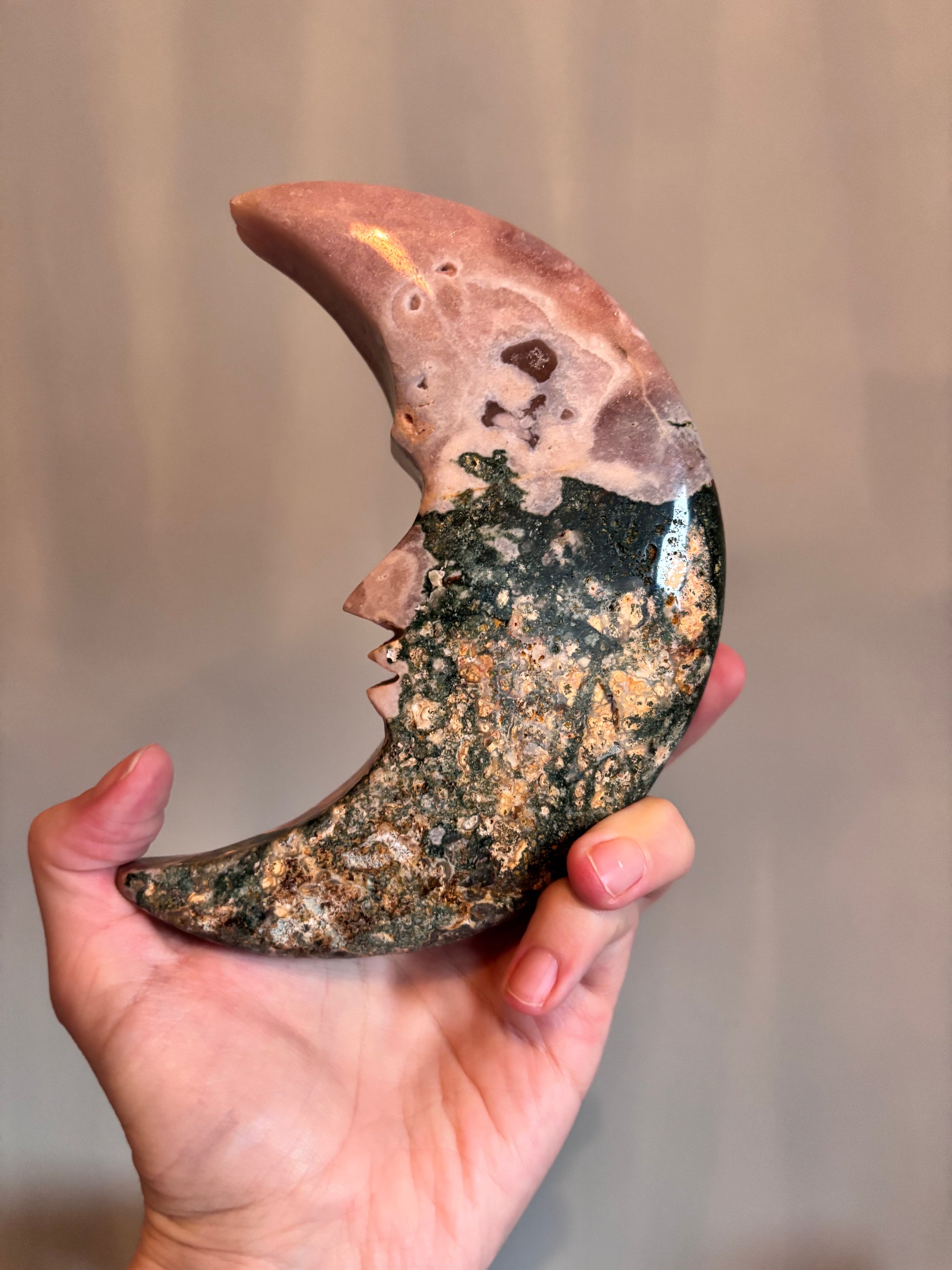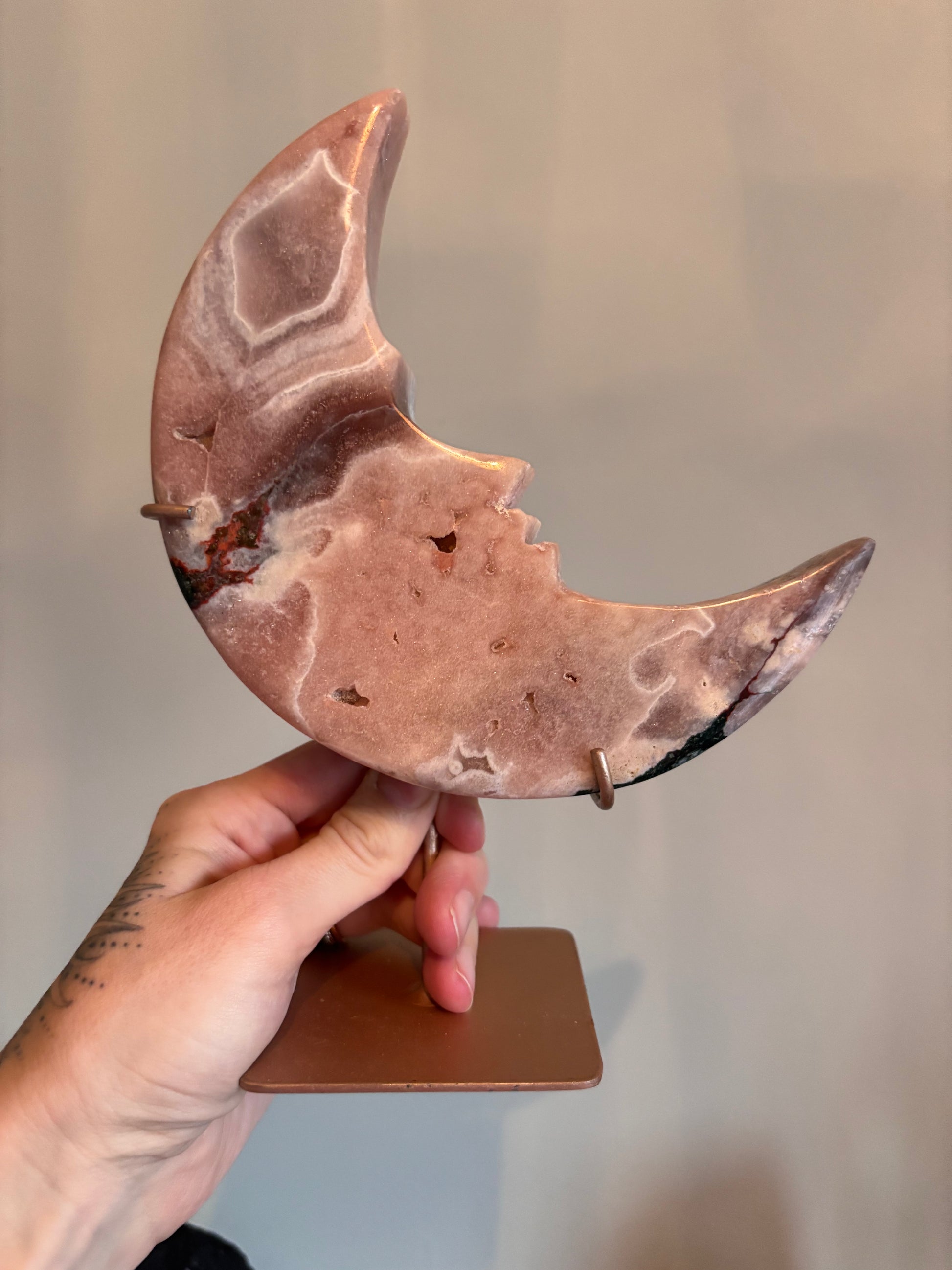 An amazing Pink Amethyst Moon. Ethically sourced from Brazil, This piece features rose gold coloured stand.